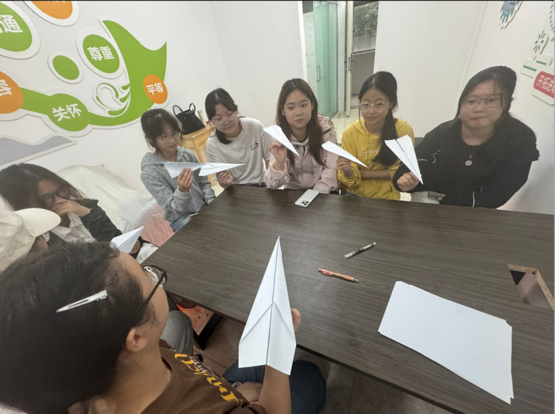 活动伊始,“梦想纸飞机”环节迅速点燃现场氛围。新生们在纸上写下对大学的期待,折成纸飞机后随机交换、彼此分享。“我希望三年后能成功专升本”“我想成为一个独立自主、有理想的人”……真挚的愿景在服务中心此起彼伏。尽管专业不同,同学们对大学生活的向往却高度契合,这一环节迅速拉近了彼此距离,为后续深入交流营造了温暖氛围。