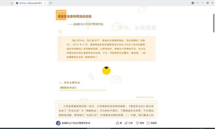 为深入贯彻习近平总书记关于保障国家粮食安全的重要论述,积极响应江苏省2025年世界粮食日和全国粮食安全宣传周活动号召,南通职业大学经管学院紧密结合专业特色与学生实际,于2025年9月12日至10月27日,以“粮食节约 人人有责”为主题,精心策划并开展了一系列形式多样、内容丰富的粮食安全宣传教育活动,旨在增强师生粮食安全意识,营造节约粮食的良好氛围,推动校园形成勤俭节约新风尚。