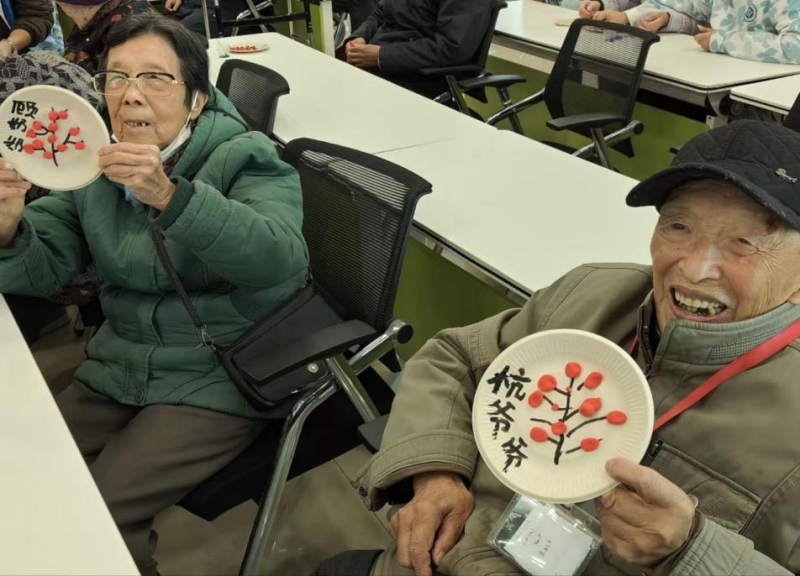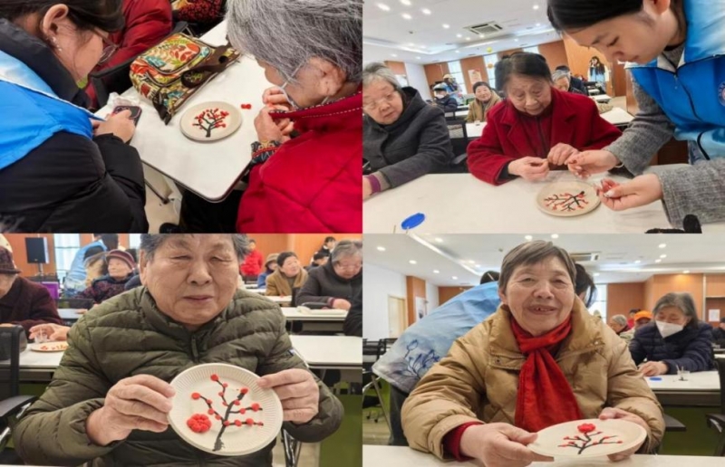 "梅花手作"环节将美育实践推向高潮。志愿者引导老人用棉签勾勒梅枝的苍劲,以粘土塑造梅花的娇艳。顾奶奶颤抖的双手在志愿者耐心指导下完成人生首幅梅花作品时,眼角泛起的泪光与作品旁歪扭却真挚的姓名题字,共同构成了"美育浸润"的动人场景。
